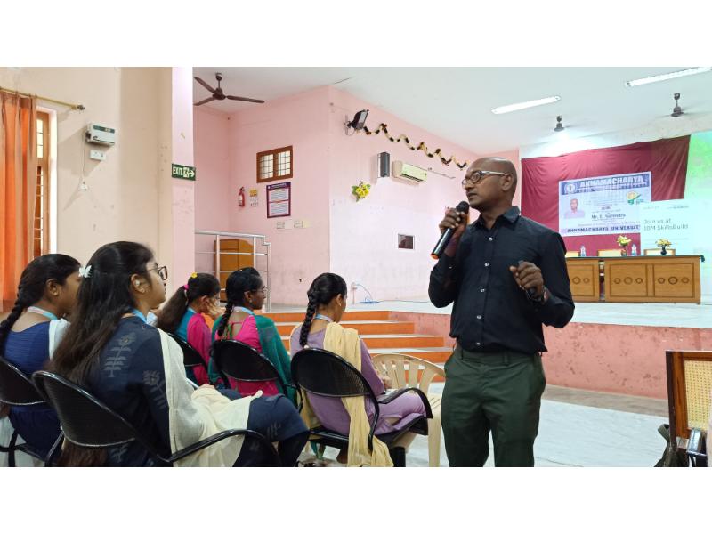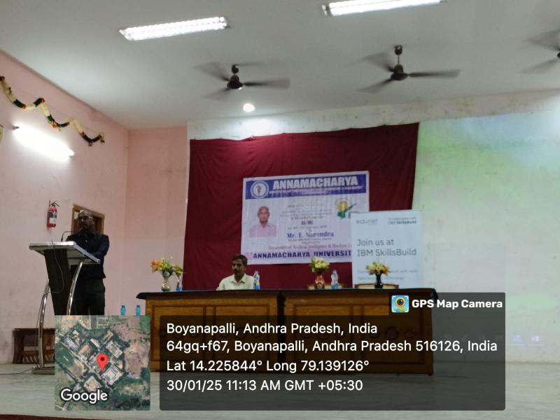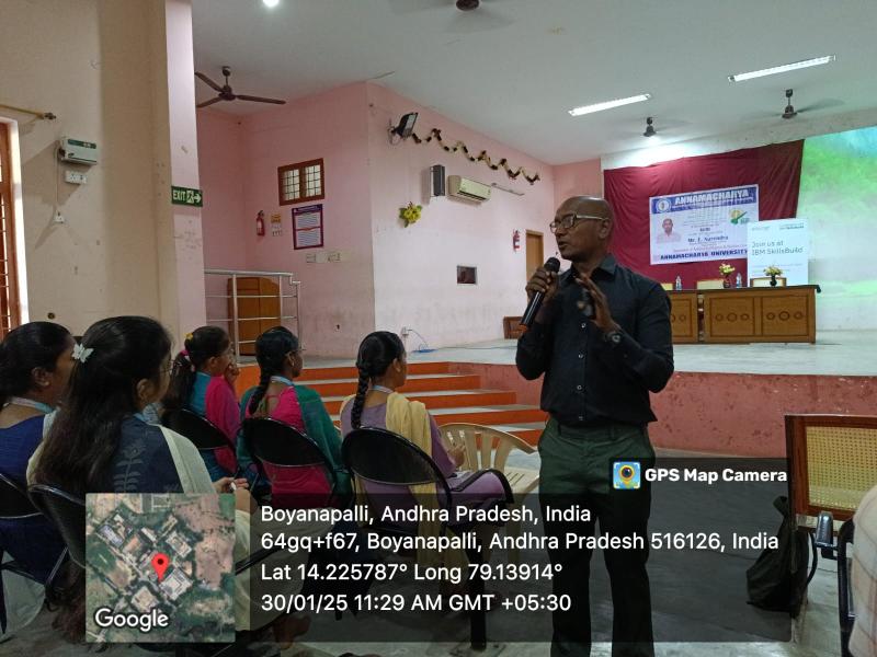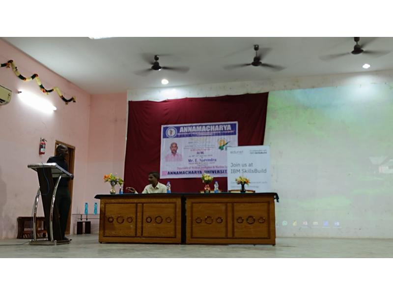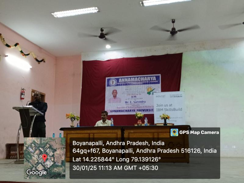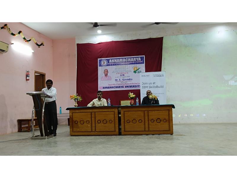 The chief guest for the event was Mr. E. Narendra, an IBM Skill Trainer from Edunet, Guntur. Addressing the participants, Mr. Narendra emphasized that Artificial Intelligence has brought revolutionary changes across various sectors in today’s era. He noted that in the coming days, technologies like AI, Machine Learning, and Deep Learning would emerge as powerful tools shaping the world.