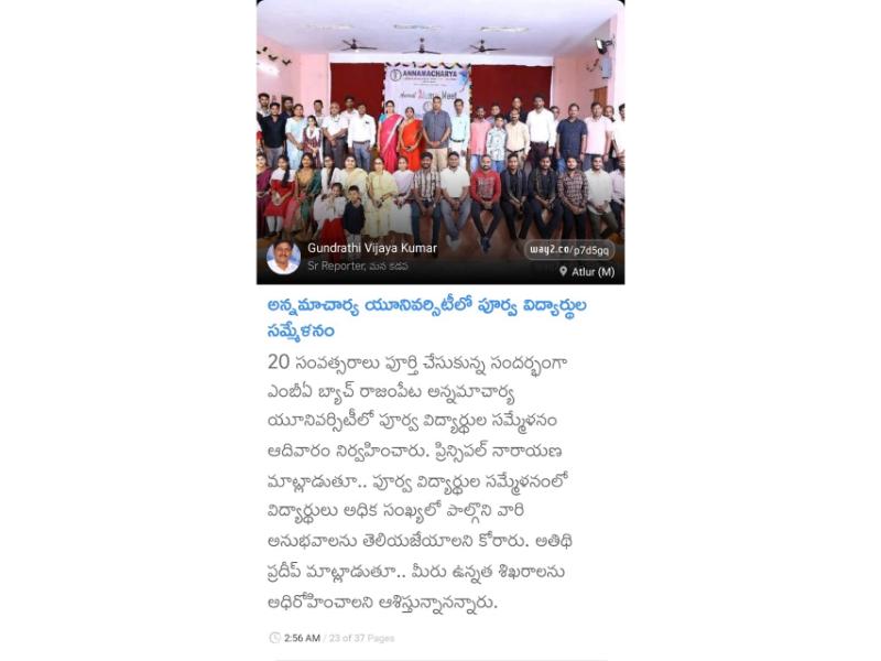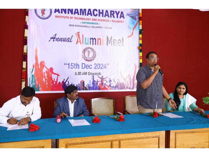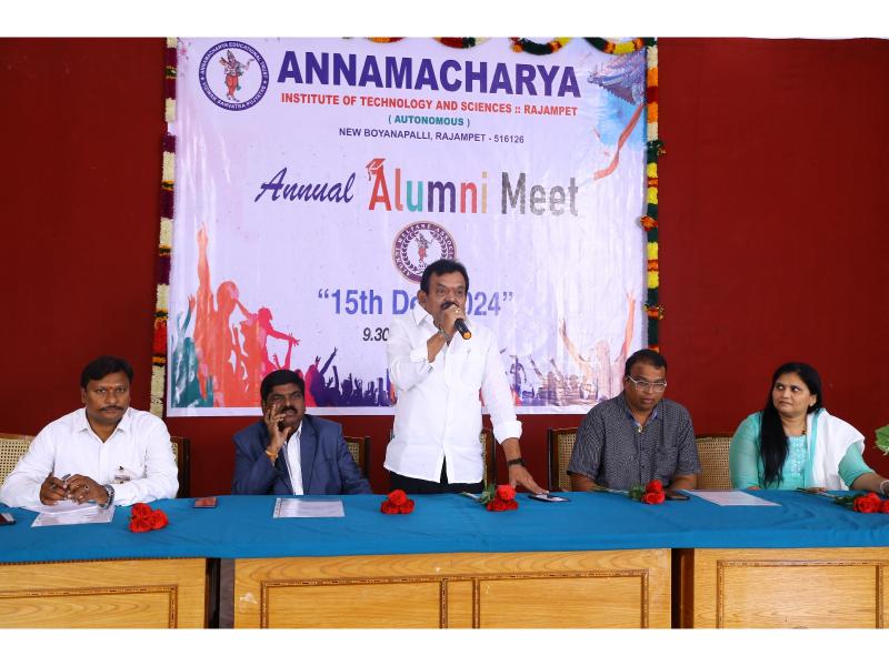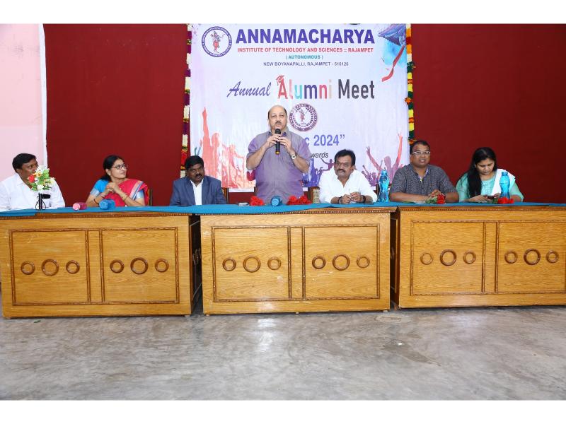 The Alumni Meet 2024 was celebrated with great enthusiasm at Annamacharya Institute of Technology and Sciences, Rajampet, now part of Annamacharya University. Organized under the aegis of the Alumni Association, the event brought together former students to relive memories and share their experiences. Chief Guest Sri Choppa Yella Reddy expressed his joy at seeing alumni gather annually, revisiting their alma mater and cherishing the bonds formed during their student years. He praised the disciplined and well-educated alumni for leading exemplary lives and contributing positively to society.