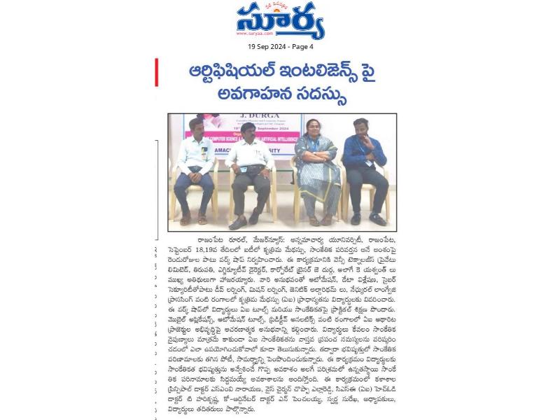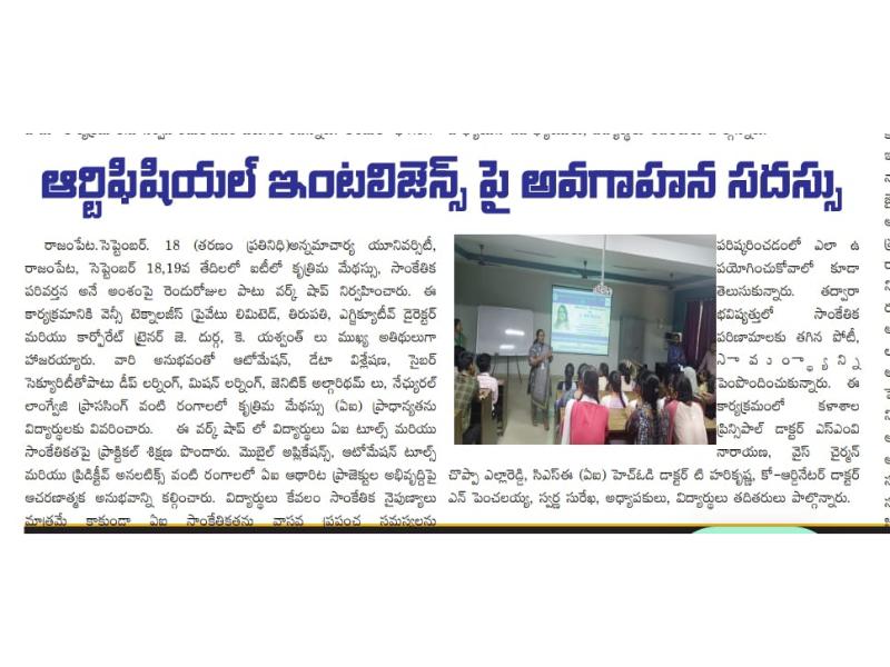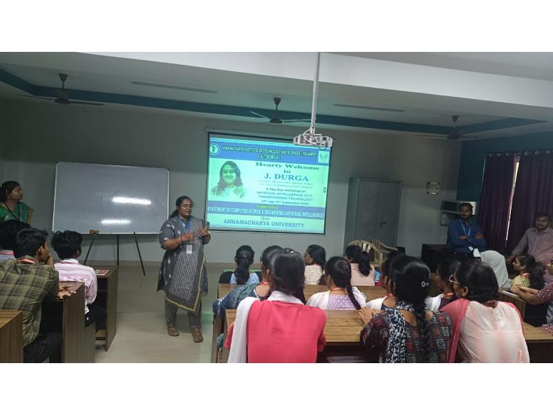 The Department of Computer Science and Engineering (Artificial Intelligence) at Annamacharya Institute of Technology and Sciences, now Annamacharya University, organized a two-day workshop on "Artificial Intelligence in IT: Transforming Technology" on 18th and 19th September 2024. The workshop was conducted by Ms. J. Durga, Executive Director and Corporate Trainer from Sri Vensy Technologies Pvt. Ltd., Tirupati. The event aimed to provide students with insights into the transformative role of artificial intelligence in the IT industry, focusing on how AI technologies are reshaping business operations, decision-making, and technological advancements.