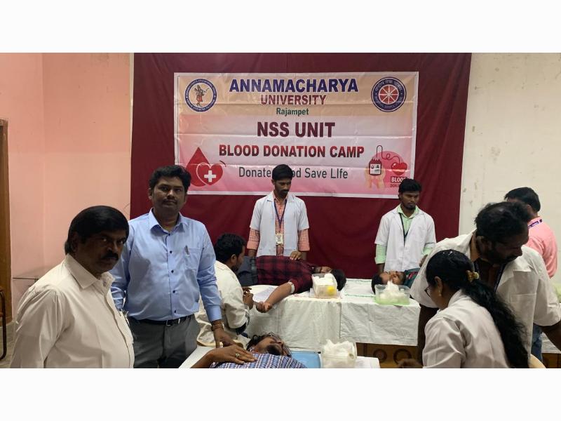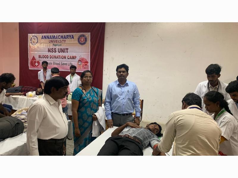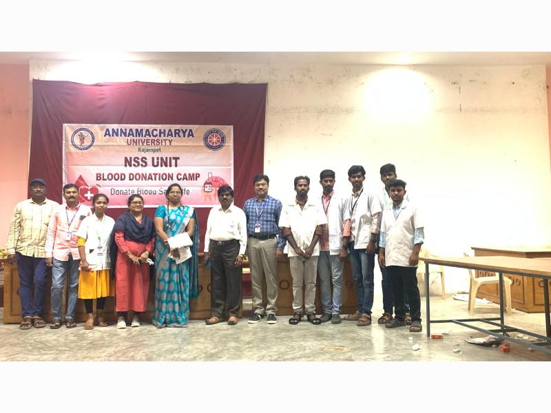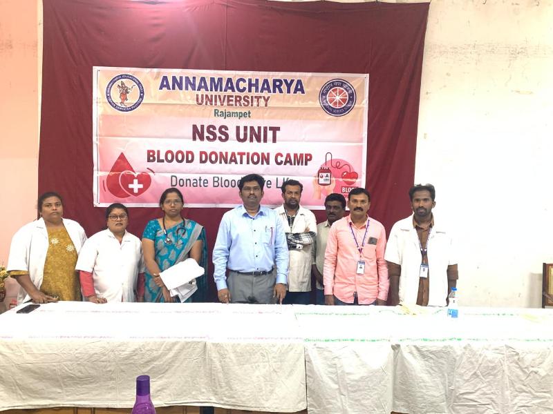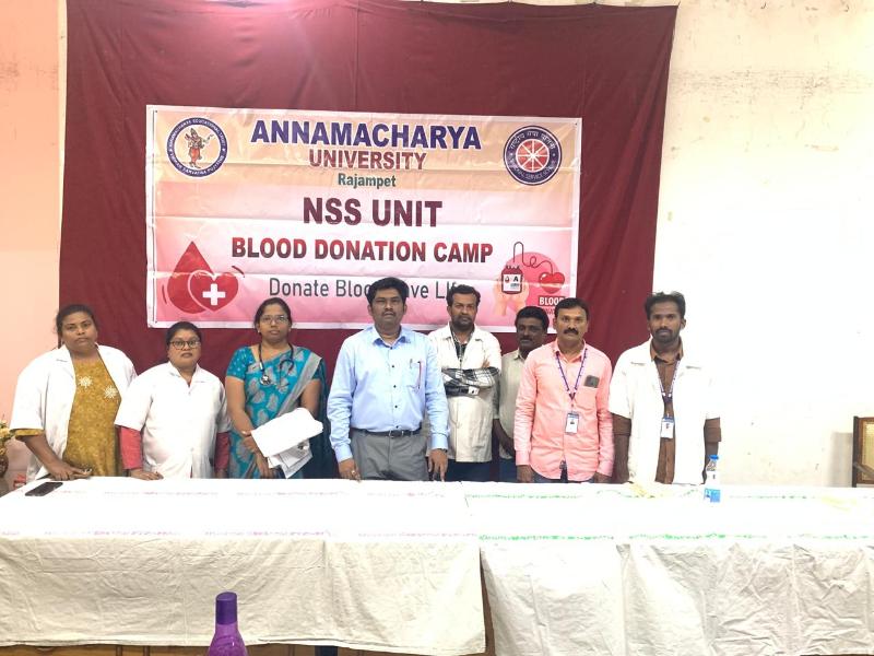 Rajampet: A Blood Donation Camp was successfully organized on 10.02.2025 at the Annamacharya University campus, in collaboration with the Rajampet Regional Government Hospital. The camp was conducted under the supervision of Dr. P.V. Nageswara Raju, Superintendent of the Regional Government Hospital, Rajampet, and Dr. M. Subhashree, Medical Officer. Support staff from RIMS Kadapa also extended their assistance for this noble cause.