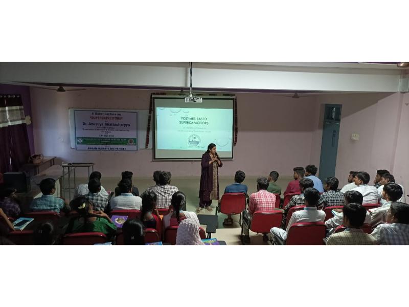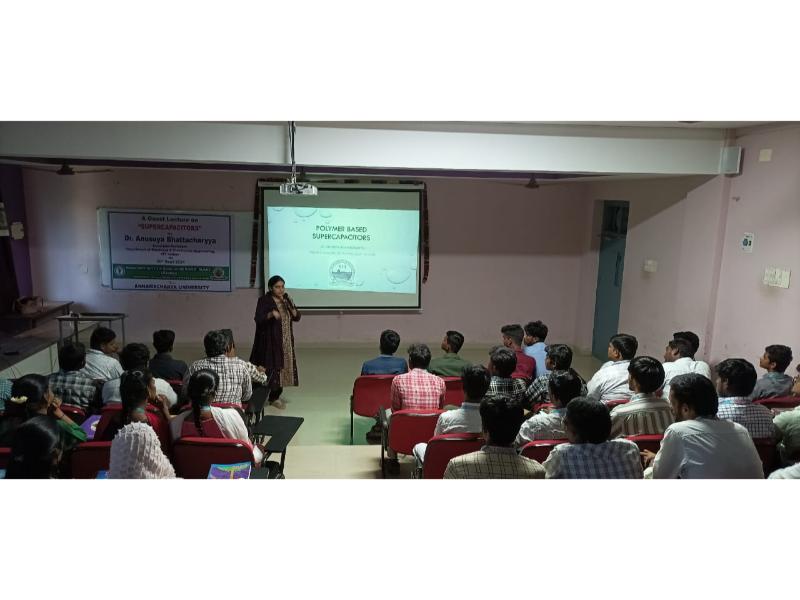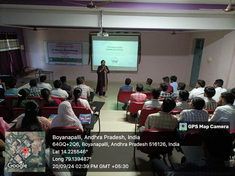 The Department of Electrical and Electronics Engineering at Annamacharya Institute of Technology and Sciences (now Annamacharya University) organized a guest lecture on "Novel Super capacitor for Energy Storage Applications" on 20th September 2024. The lecture was delivered by Dr. Anusuya Bhattacharyya, Associate Professor in the Department of Electrical and Electronics Engineering at VIT Vellore. Dr. Bhattacharyya provided an in-depth exploration of the innovative role of supercapacitors in energy storage, emphasizing their advantages in terms of high power density, rapid charge-discharge cycles, and potential applications in renewable energy systems. The event was successfully coordinated by Mr. L. Baya Reddy, who played a crucial role in organizing and executing the program.