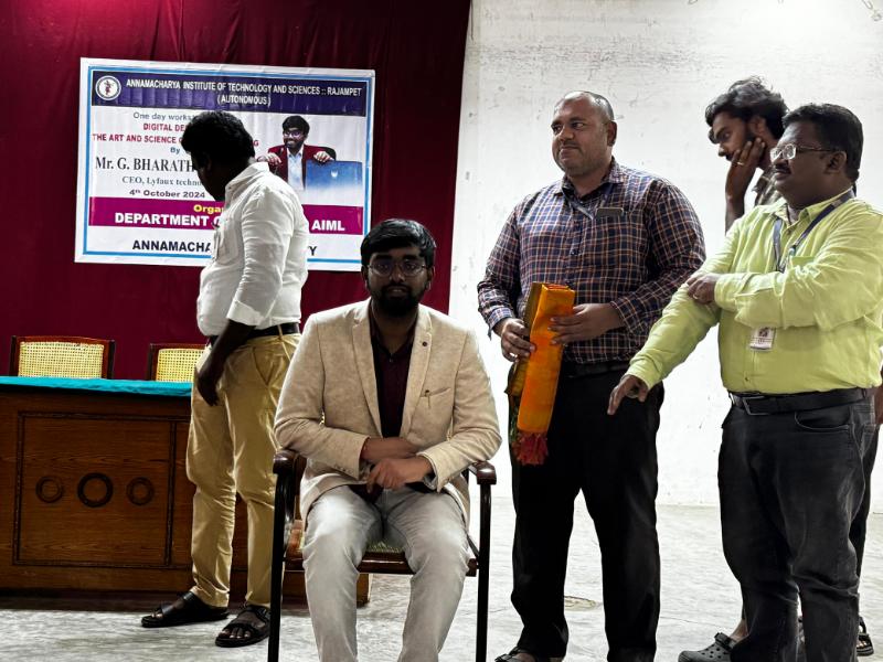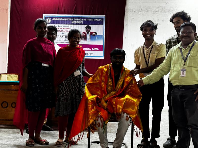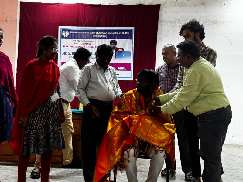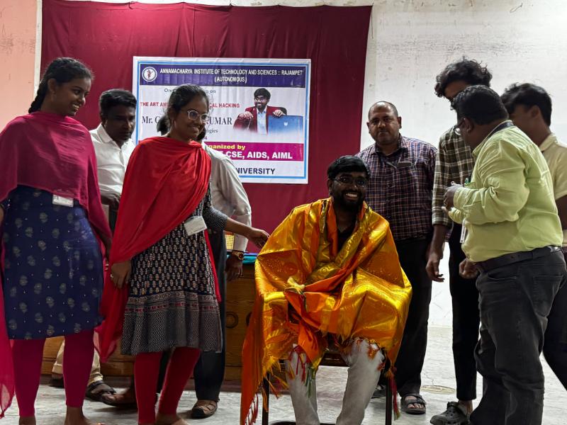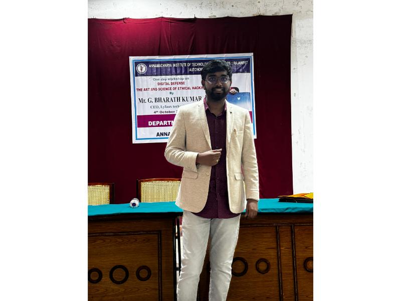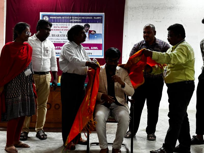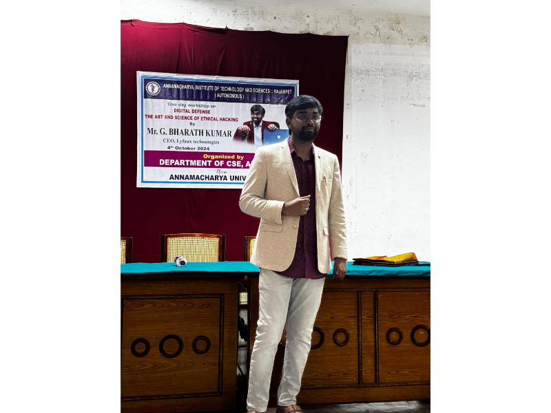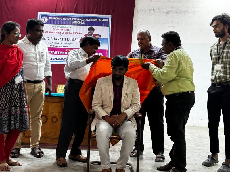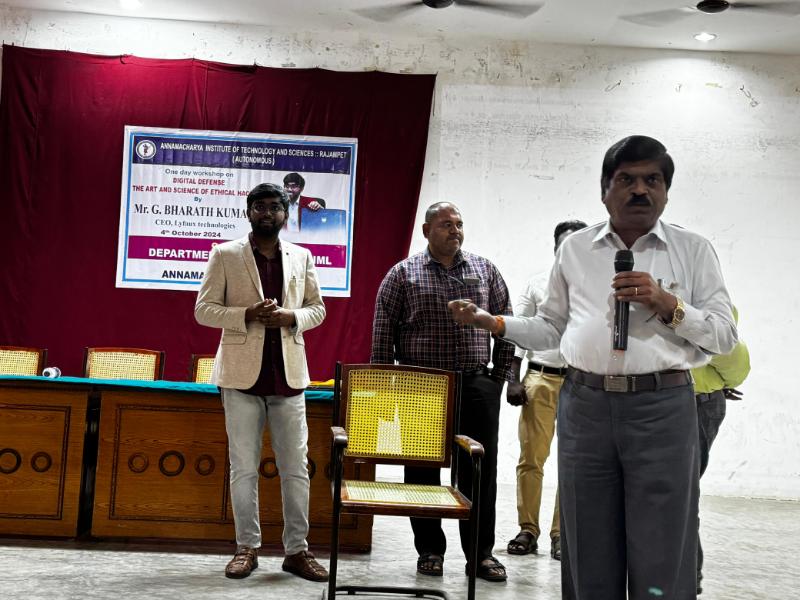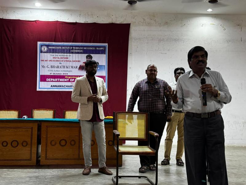 The Department of Computer Science and Engineering (CSE), Artificial Intelligence and Data Science (AIDS), and Artificial Intelligence and Machine Learning (AIML) at Annamacharya Institute of Technology and Sciences, now Annamacharya University, organized a one-day workshop on "Digital Defense: The Art and Science of Ethical Hacking" on 4th October 2024. The workshop was conducted by Mr. G. Bharath Kumar, CEO of Lyfaux Technologies. The session provided valuable insights into ethical hacking principles, digital security strategies, and practical techniques to safeguard systems against cyber threats. This event aimed to enhance participants' understanding of cybersecurity's crucial role in today's digital age.