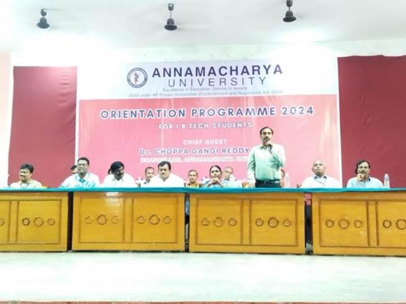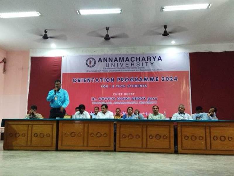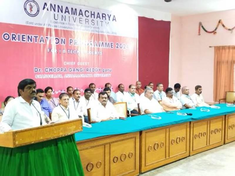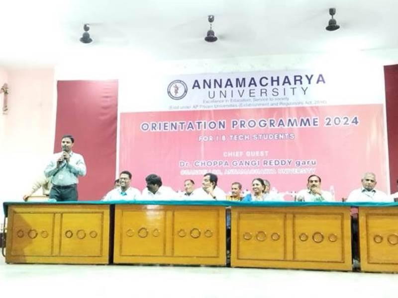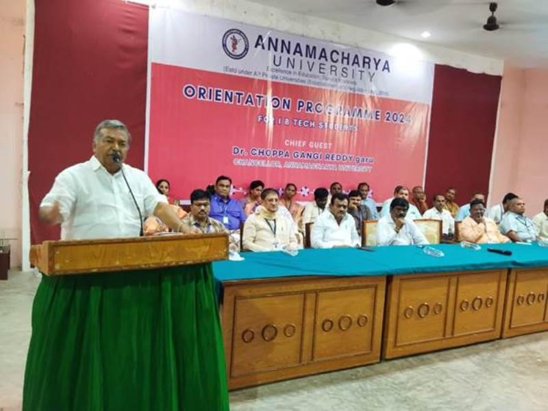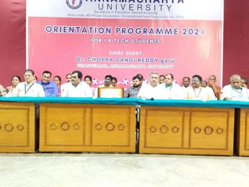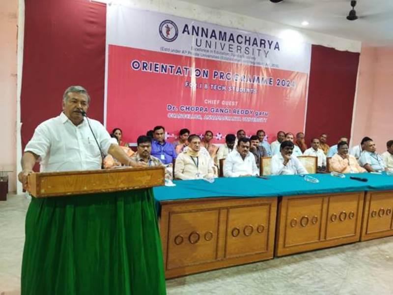 Annamacharya University recently organized an Orientation Programme for the 2024 batch of I B.Tech students. The event, graced by the presence of Dr. Choppa Gangi Reddy, Chancellor of Annamacharya University, served as a formal welcome to the new students, marking the beginning of their academic journey. The program was designed to familiarize the students with the university’s values, academic structure, and the resources available to them throughout their studies. Faculty members and other dignitaries also took part in the event, emphasizing the importance of discipline, hard work, and the pursuit of excellence.