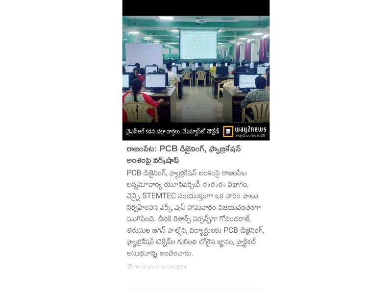 The Department of Electrical and Electronics Engineering at Annamacharya University, Rajampet, organized a one-week workshop on "PCB Designing and Fabrication" from 21st October 2024, exclusively for third-year EEE students. The workshop was conducted in collaboration with STEMTEC, Chennai, a reputed organization known for its expertise in electronics training. The program aimed to equip students with practical skills in Printed Circuit Board (PCB) designing and fabrication, focusing on technical and industry-relevant knowledge.