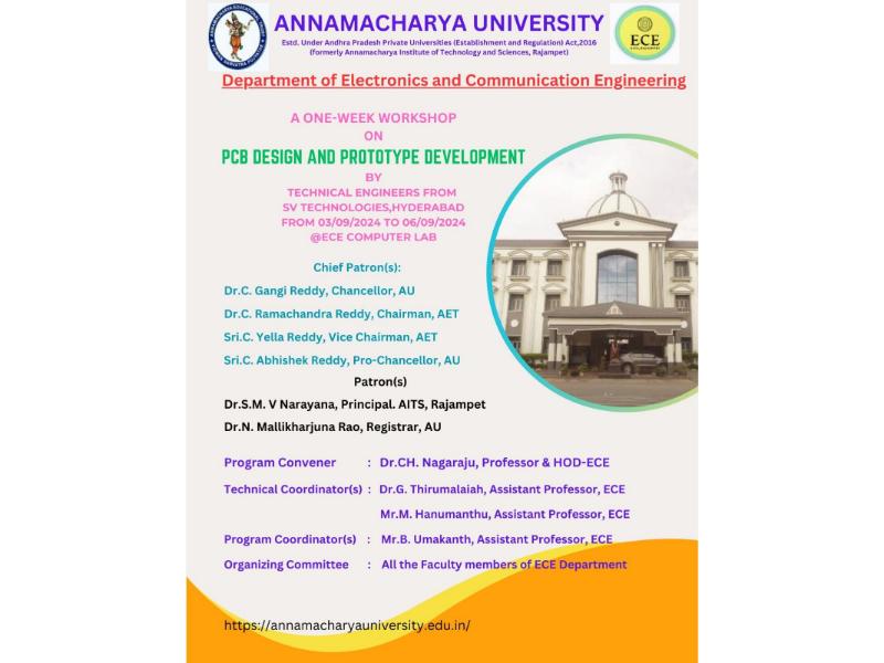 Event Description: The Department of Electronics and Communication Engineering at Annamacharya University is organizing a one-week workshop on "PCB Design and Prototype Development" from 3rd to 6th September 2024. The workshop, hosted in the ECE Computer Lab, will be conducted by technical engineers from SV Technologies, Hyderabad. It aims to equip students with practical knowledge and hands-on experience in designing printed circuit boards (PCBs) and developing prototypes, which are critical skills in the field of electronics and embedded systems. This initiative is designed to bridge the gap between theoretical knowledge and industry practices, empowering students to excel in advanced technological domains.